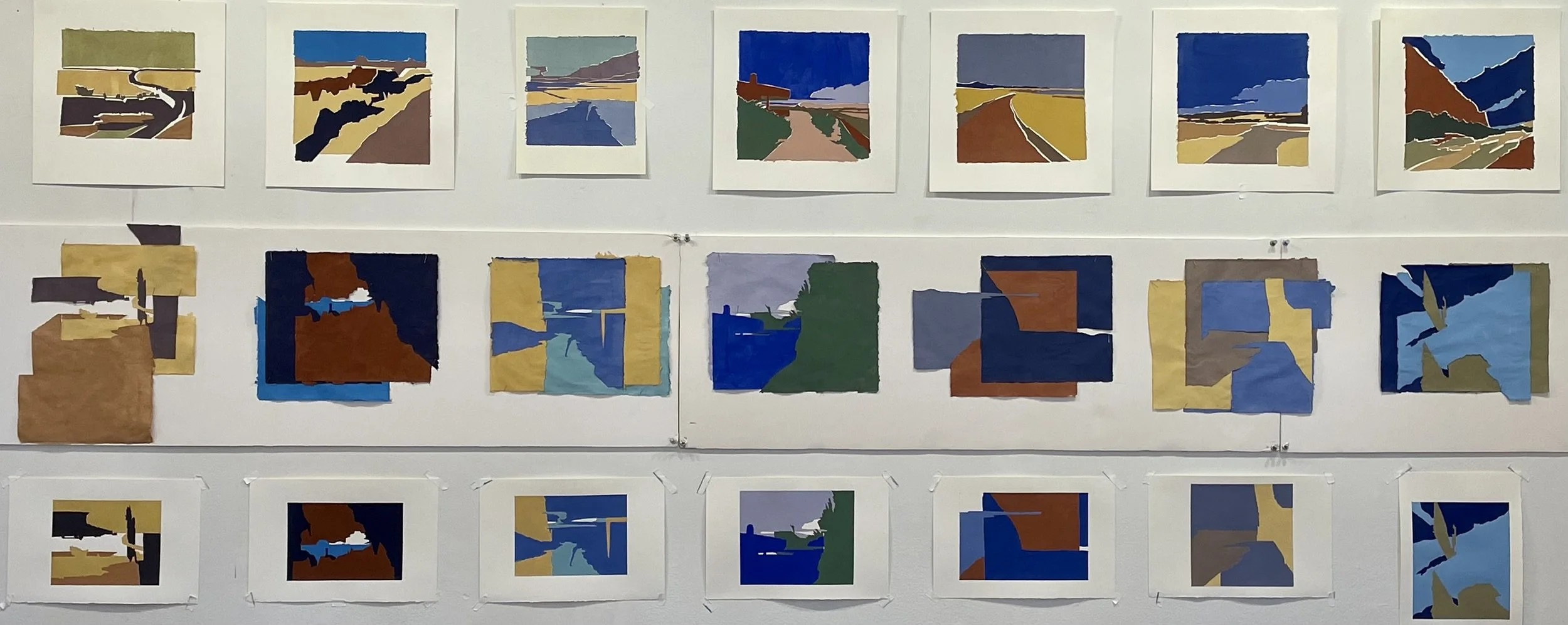 This color practice has influenced my collage landscapes. I hand painted Mulberry paper with