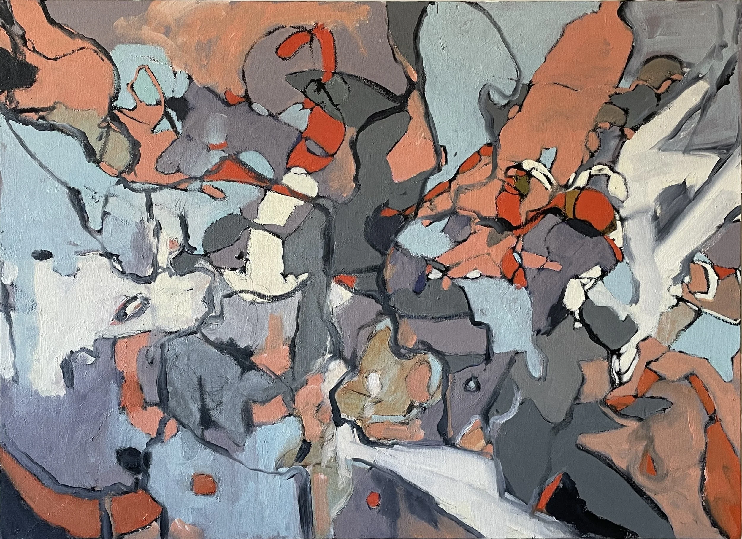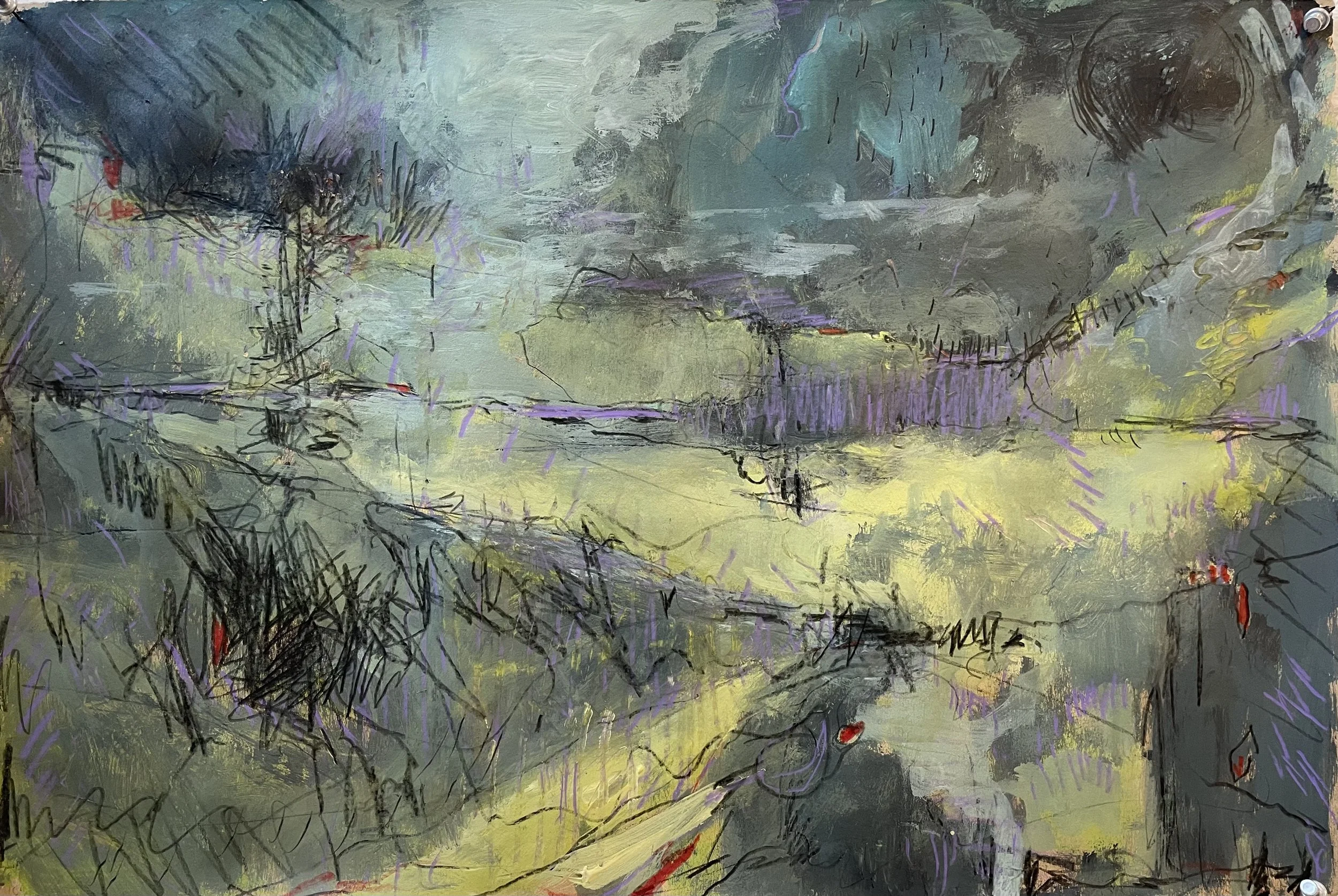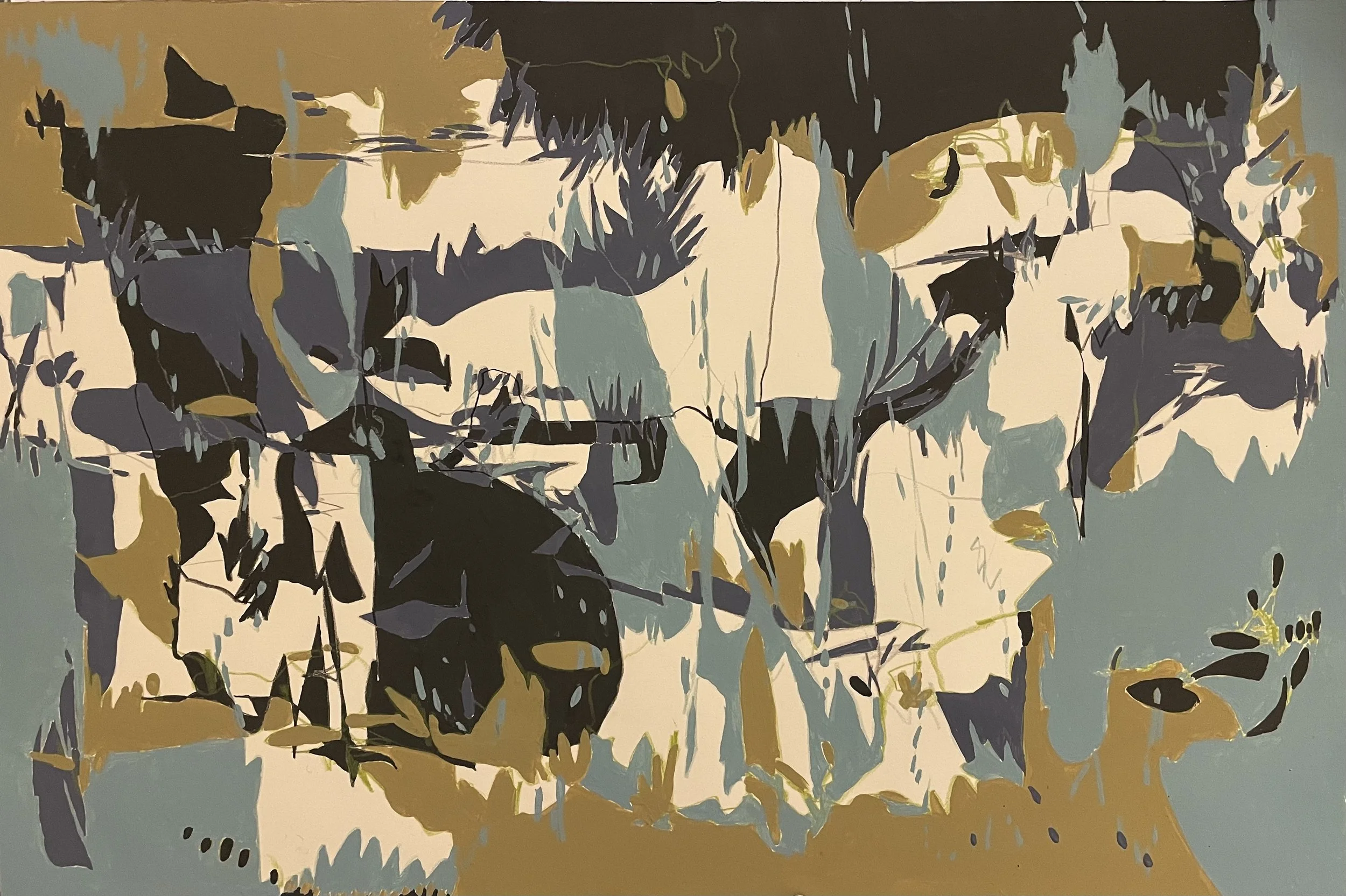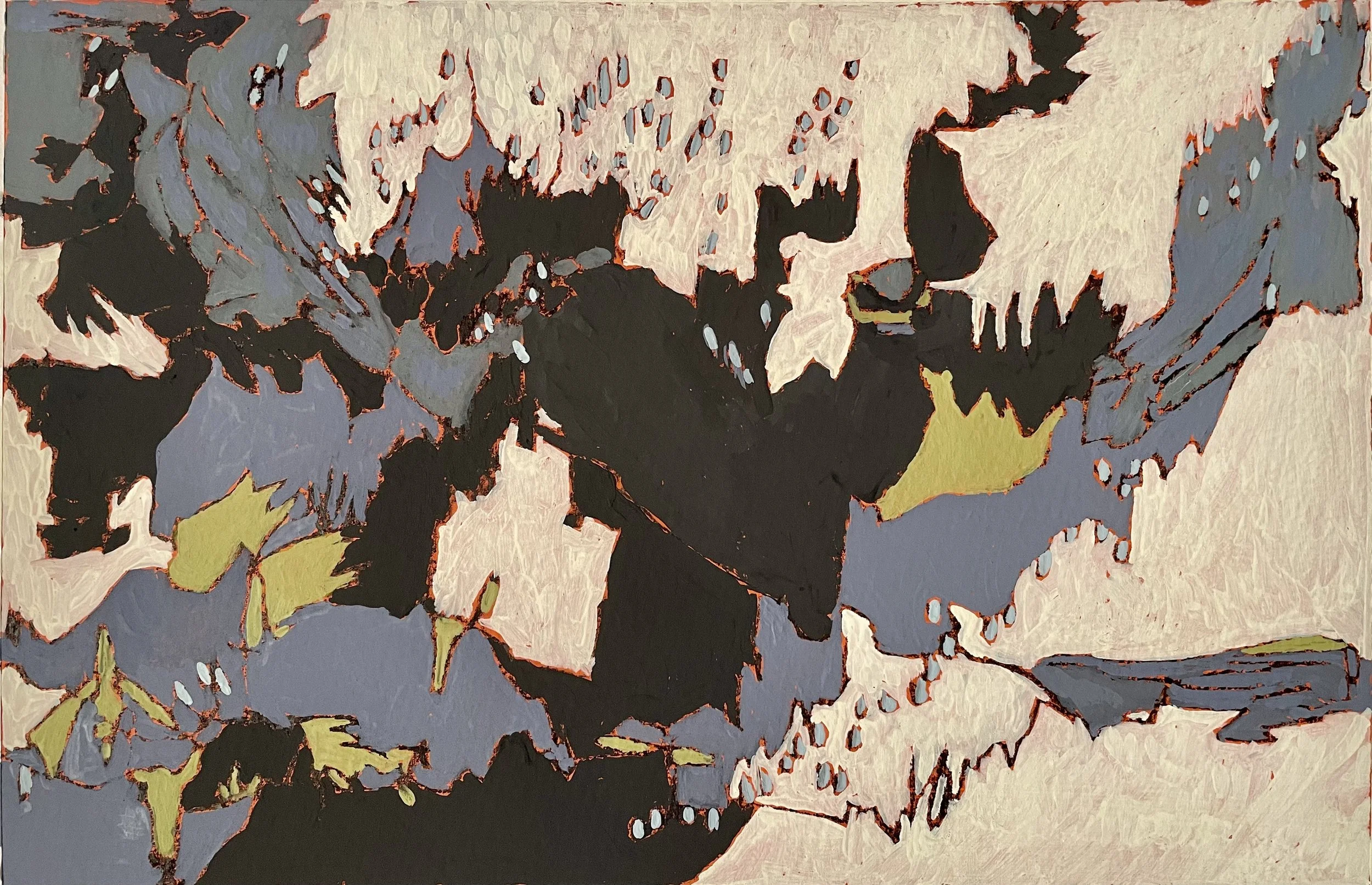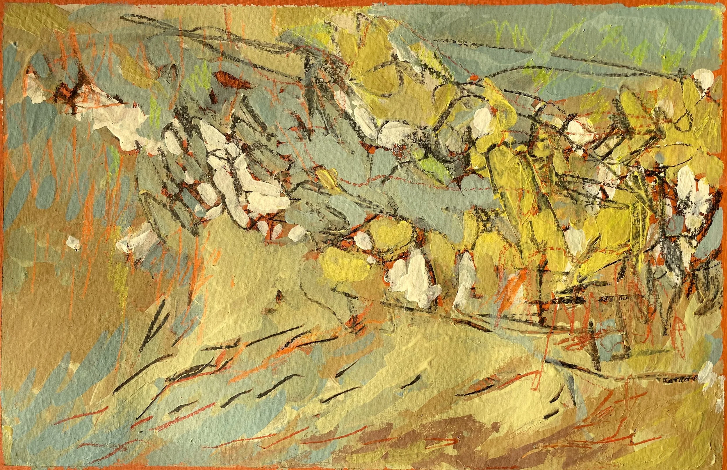 These abstract paintings are inspired by sensory remnants of remembered aspects of being out in nature. They express a process of letting go of depicting and a connection with movement, sound and feeling.